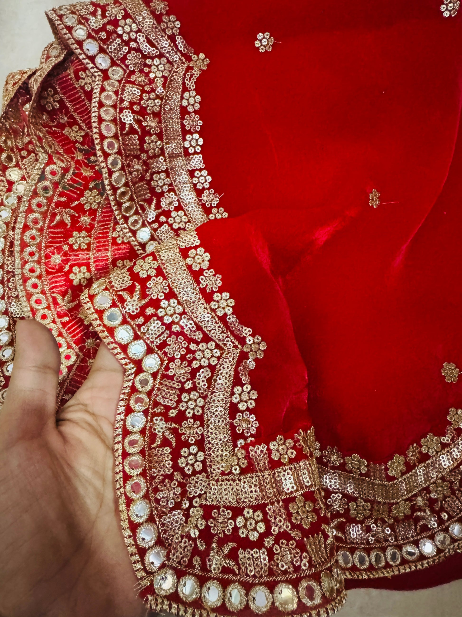 Bridal Red Dupatta, beautifully crafted from soft silky-type fabric and detailed with zari and mirror handwork. The smooth texture and graceful fall make it perfect for weddings, festive occasions, and traditional functions.