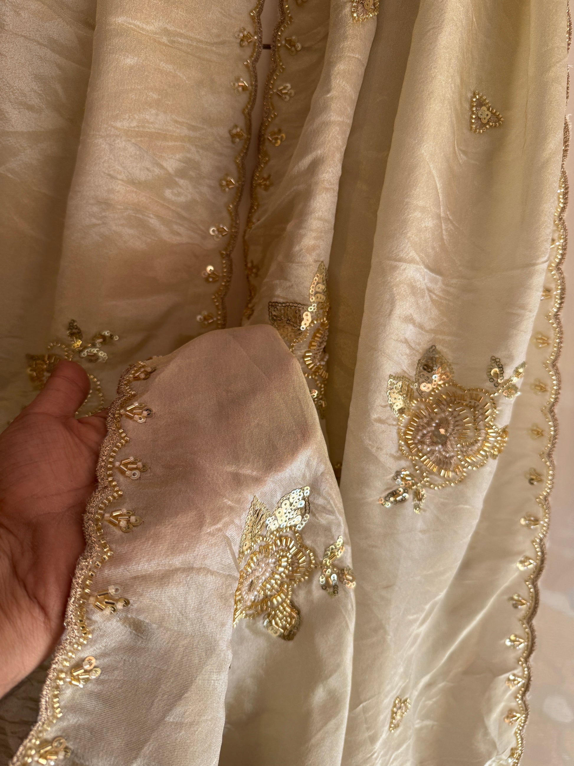 Add a touch of luxury to your look with this elegant Golden Tissue Dupatta featuring delicate beads and sequins handwork. Lightweight, festive and perfect for bridal, partywear and ethnic outfits.